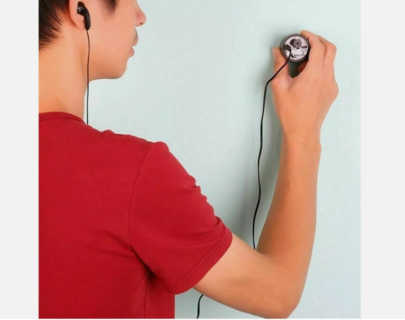 This audio amplifier has a gain knob that helps you increase the volume of the sound you hear through a wall, with the push button that activates the device one it is pressed against the surface.