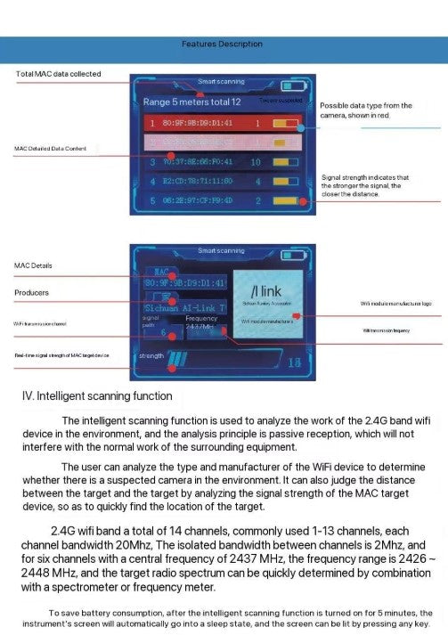 6.battery life: Broadband Detection:150-220ma Smart Scan:230MA